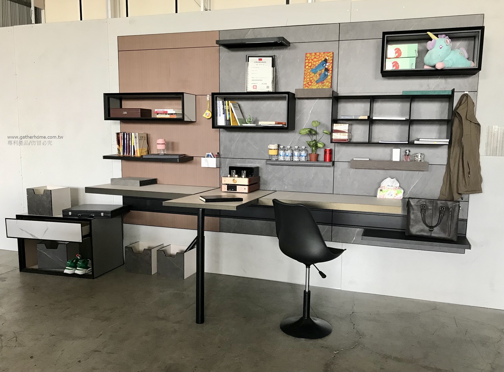 安裝水平式多功能背景牆,即可吊掛任何物件,當然包含桌板。