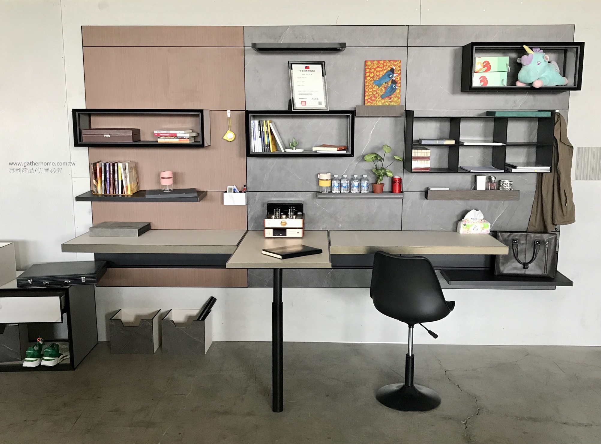 安裝水平式多功能背景牆,即可吊掛任何物件,當然包含桌板。